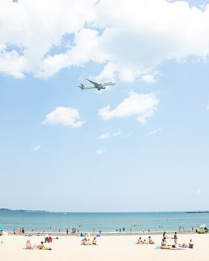 A plane from Boston's Logan Airport flies over nearby Revere Beach and its beachgoers below.