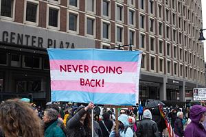 A color photo of a protester, standing in a crowd at City Hall Plaza, holding a Transgender Pride flag that says, “Never Going Back!” Boston, MA. 2025.