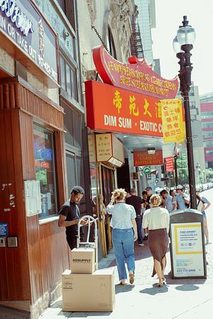 A color photo of a delivery driver looking at his clipboard outside of Empire Garden Restaurant in Chinatown. Pedestrians walk by and wait outside on Washington Street in the Boston neighborhood. Boston, MA. 2025.